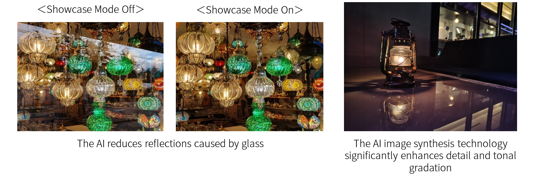 For the first time in the "AQUOS sense" series, the device features an AI function that automatically removes shadows during food and text photography. Additionally, a new "Showcase Mode" has been introduced, which reduces reflections from glass and aquariums. This allows users to take photos with their desired compositions without worrying about reflections, eliminating the need for post-editing. Furthermore, text capture includes both shadow removal and correction for trapezoidal distortion, making images easier to read.