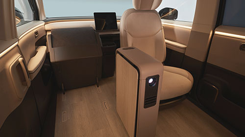 - With a retractable screen stored in the roof and a projector tucked inside the console box, the interior transforms into a theater.