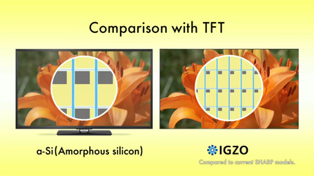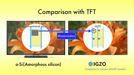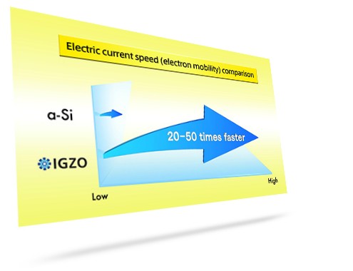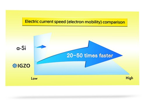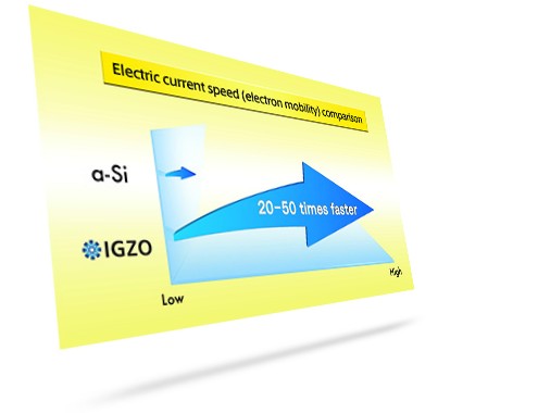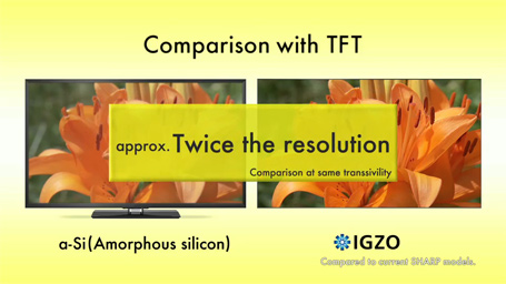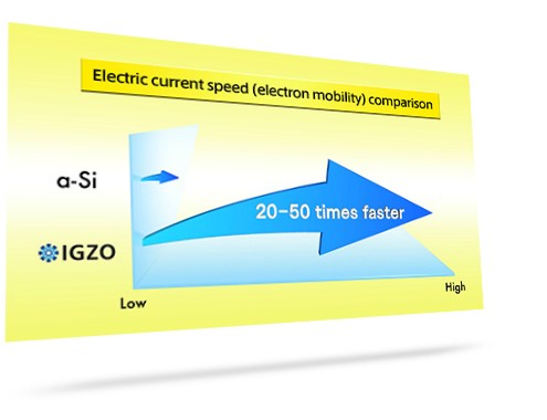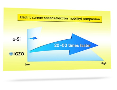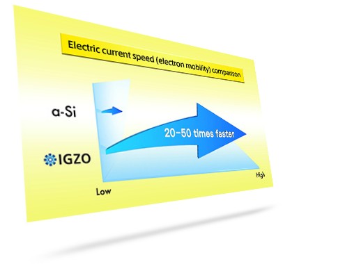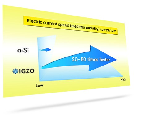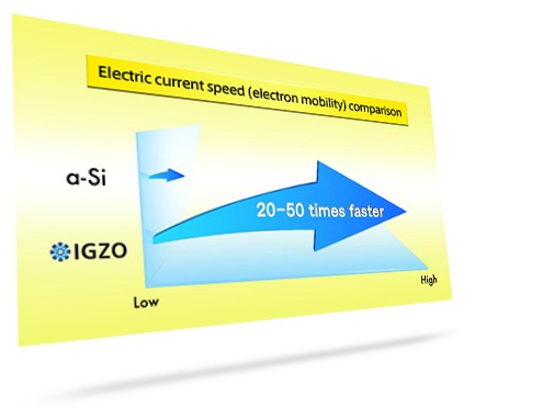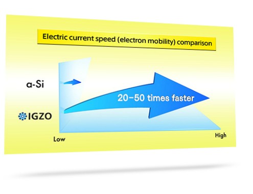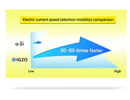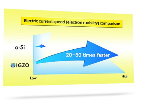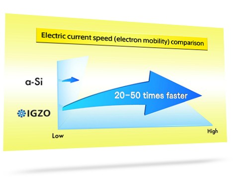 The electron mobility rate is a measure of how easily electrons can flow within a solid body. Compared with the electron mobility rate for the amorphous (non-crystalline) silicon semiconductors widely used in liquid crystal panels, the rate for "IGZO" is 20-50 times greater, allowing liquid crystal technology to further evolve.