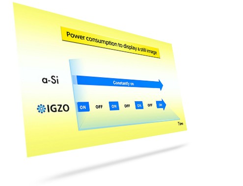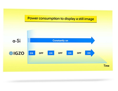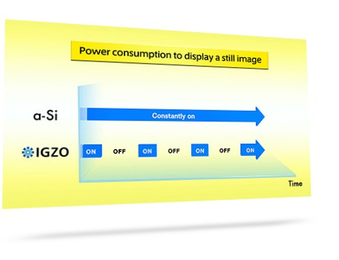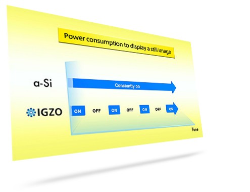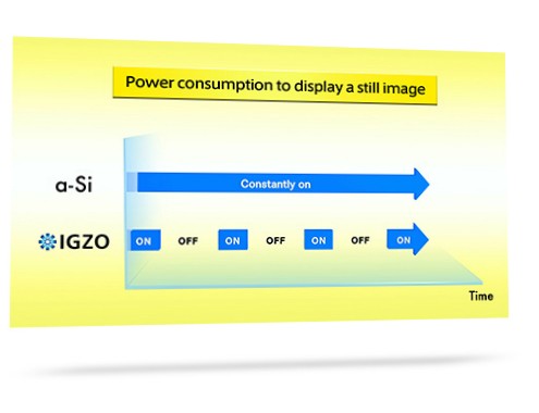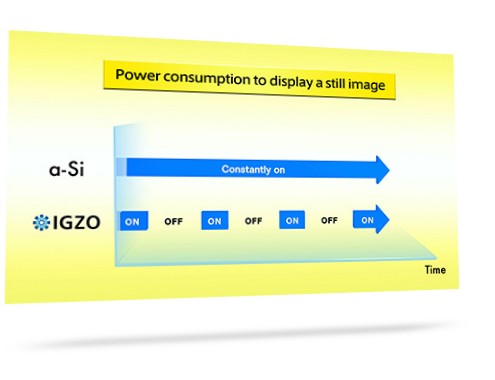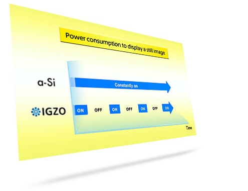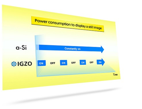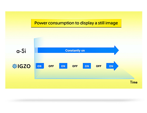Major strength of "IGZO" is in its low power consumption. Previous screens had to overwrite still image data, but "IGZO" keeps it without overwriting even when the power is off. For this reason, "IGZO" reduces power consumption to a fifth or even a tenth that of conventional screens. In this way, "IGZO" also contributes greatly to longer battery life.