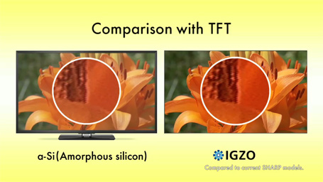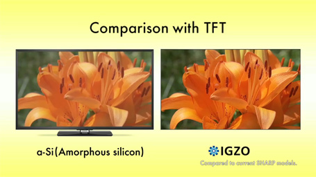 The "IGZO" product mass-produced by Sharp is display using the CAAC or nano-crystal "IGZO" crystalline oxide semiconductor jointly produced by Sharp and Semiconductor Energy Laboratory Co., Ltd. This component supports the feature of high reliability described above.