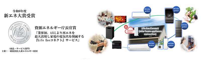 Sharp’s energy management service “Life Eee Connect,” which integrates solar power systems with home appliances and residential equipment to reduce electricity costs, has won the Director-General of the Agency for Natural Resources and Energy Award in the product and service category at the New Energy Award 2024, organized by the New Energy Foundation (sponsored by the Ministry of Economy, Trade and Industry). The New Energy Award is a system that recognizes excellent examples of the development of equipment and services related to new energy and the use of distributed energy, with the aim of promoting the introduction of new energy such as solar power.