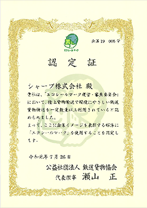 In fiscal 2024, Sharp Group greenhouse gas (GHG) emissions from shipping activities in Japan were 10,000 tons CO2. For Sharp Corporation, energy intensity was improved by an average of 8% for the most recent five years (fiscal 2020 to 2024). Sharp is steadily implementing a modal shift*2, a change from conventional trucking to more environmentally friendly modes of transport, such as shipping (non-international coastal trading vessels) and rail (Japan Railways containers). And, by unloading imported goods at harbors chosen for their proximity to their main sales locations, Sharp is reducing re-transport between distribution centers. These efforts enable Sharp to reduce the environmental impact of its distribution activities. For shipments, Sharp has been certified with an Eco Rail Mark*3 by the Ministry of Land, Infrastructure, Transport, and Tourism and the Railway Freight Association.