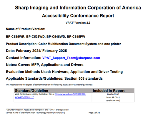 Under U.S. federal law*1, federal agencies purchasing equipment and services are obligated to choose those that are accessible to everyone, regardless of restrictions. For Sharp digital MFPs and other products, assessment results of accessibility standards stipulated by federal law are compiled on a product evaluation sheet (VPAT*2), which is disclosed on the website of Sharp Electronics Corporation (SEC), Sharp’s U.S. sales company.