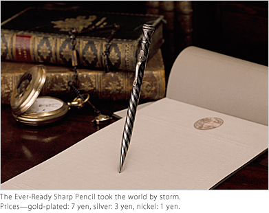 Tokuji, along with his brother, established the Hayakawa Brothers Shokai metal stationery factory. But, the Hayakawa Mechanical Pencil might have been too far ahead of its time. Initially, he heard only critical opinions from stationery wholesalers, and it did not sell at all. Its success began in the most unexpected of places. The First World War led to a shortage of supplies in Europe, and as a consequence, the brothers received a large order from a Yokohama trading house. Markets in Europe and the United States recognized its superior quality, and the Hayakawa Mechanical Pencil became a much-sought-after item. Its reputation also began to spread in Japan, and they were soon awash in a wave of offers for deals from wholesalers in Japan. In addition, the pencil lead used in the Hayakawa Mechanical Pencil was improved to become extremely fine. This is what ultimately made it a hit product, and the name was changed to the “Ever-Ready Sharp Pencil.” This became the origin of “Sharp,” the subsequent name of the company. It should also be noted that the Hayakawa Mechanical Pencil was granted patents in the United States, as well as in Japan.
