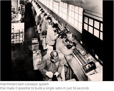 It had been in Tokuji’s nature to constantly pursue greater efficiencies in work, and ever since he founded the company, he had focused his energies on efficient production based on mechanization and assembly-line operations. What could be termed the culmination of this effort was the invention of the intermittent belt conveyor system introduced into the radio factory. In this intermittent belt conveyor system, a work platform connected to a belt moves in front of workers at a fixed time interval, stopping only during the work task. This innovation enabled radios to be assembled efficiently without placing a burden on workers. This groundbreaking system was granted a utility model patent, but Tokuji would openly show it to visitors touring the factory. This was because he felt that, if this technology could be exploited on a widespread basis, it might be able to revitalize factories and also reduce the burden on workers.