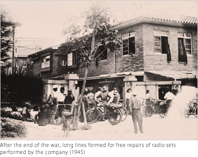 One week after the end of the war, Tokuji began to offer a free-of-charge radio repair service. Fortunately, the factory had not sustained damage from the war, but it was difficult to immediately set up a production system because of a lack of supplies. The company still possessed the skills needed for making radios. So, he decided his company would rebuild the radios that had been lying broken in various households, enabling people to once again experience the joy of listening to the radio. It is said that every day, nearly 100 people lined up who wanted to have their radios repaired. While undertaking this repair service, Tokuji established an immediate business operations plan, and made the decision to shrink the size of the factory and concentrate on producing radios.
